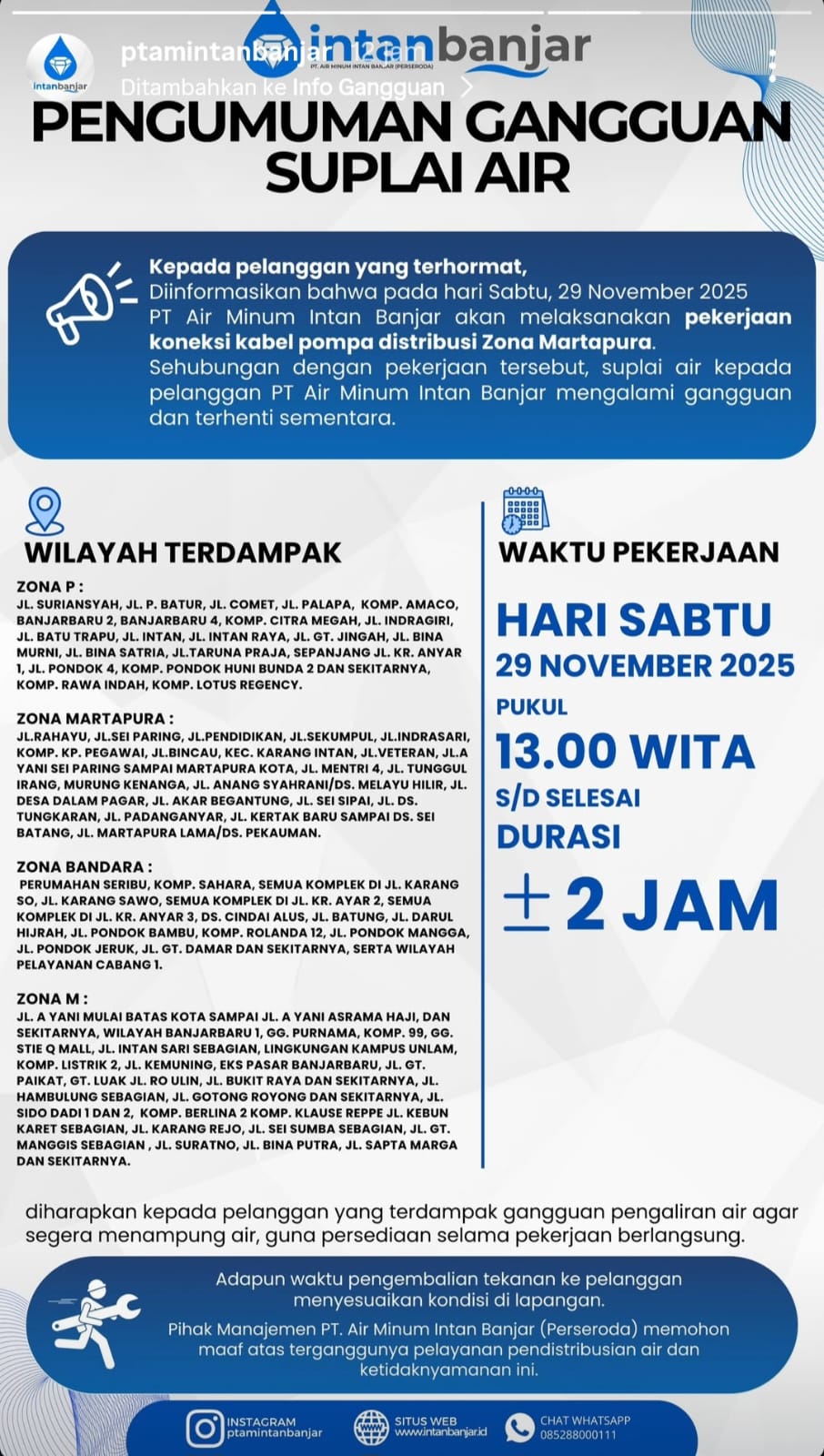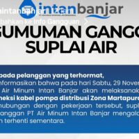 Sehubungan dengan pekerjaan tersebut, suplai air kepada pelanggan PT Air Minum Intan Banjar akan mengalami gangguan dan terhenti sementara.