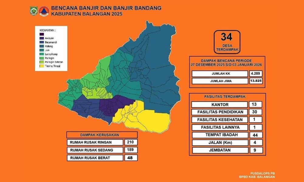 Data Pusdalops BPBD Balangan mencatat sebanyak 34 desa terdampak selama periode 27 Desember 2025 hingga 3 Januari 2026.