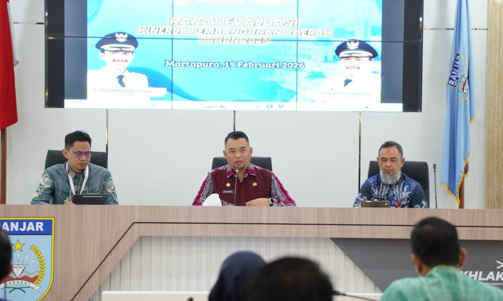 KANALKALIMANTAN.COM, MARTAPURA – Bupati Banjar H Saidi Mansyur yang diwakili Sekda Yudi Andrea membuka Rapat Evaluasi Pembangunan Daerah Tahun Anggaran 2025, di Aula Barakat, Martapura, Kamis (19/2/2026) sore.