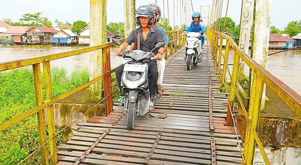 Jembatan gantung arah SDN Sungai Lulut 4 yang tampak berlubang. Foto: Prokom Banjarmasin