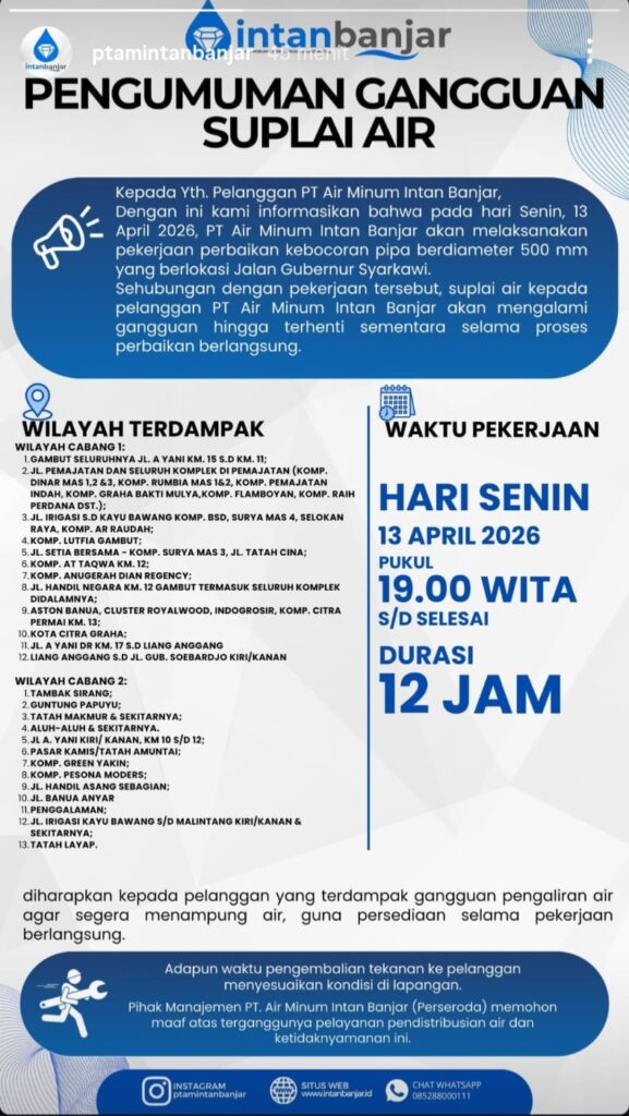 Berdasar pengumuman yang dilakukan PTAM Intan Banjar di akun resmi pada sosial media mereka akan dilaksanakan pekerjaan perbaikan kebocoran pipa berdiameter 500 mm yang berlokasi Jalan Gubernur Syarkawi.